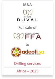 We started closing our first transaction in mid-2019 and have since then executed 15 M&A transactions in both East and West Africa, as well as in the Indian Ocean, in francophone and anglophone countries. Most of our transactions have been cross-border transactions involving investors from Africa, Europe and Asia.
